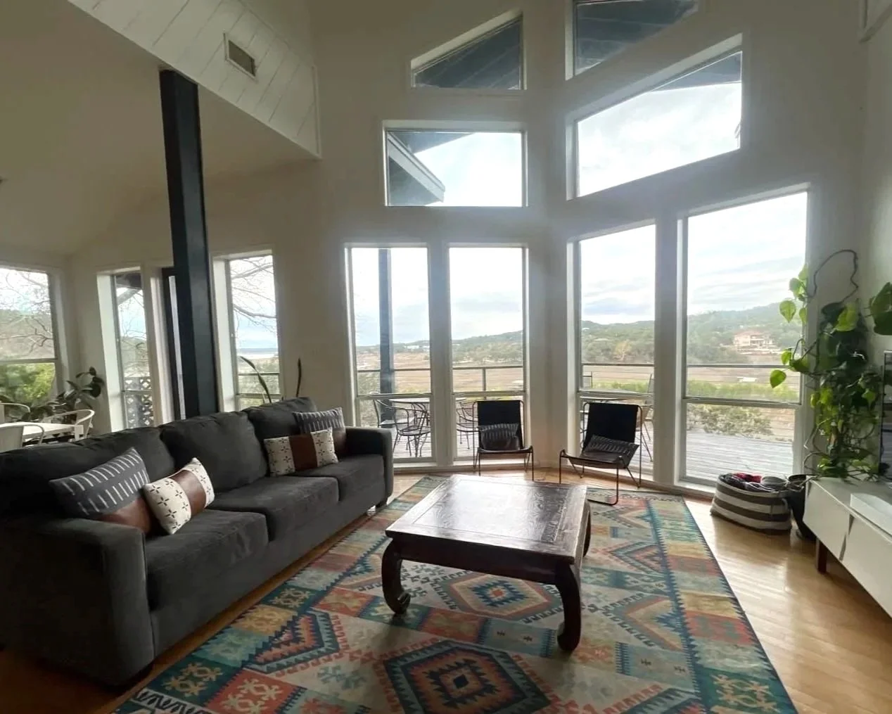 Over time, several details in the living room no longer matched the listing photos. The area rug had been replaced with a different one, the coffee table was chipped, and the plant was dying, leading guests to rate the property lower in listing accuracy.