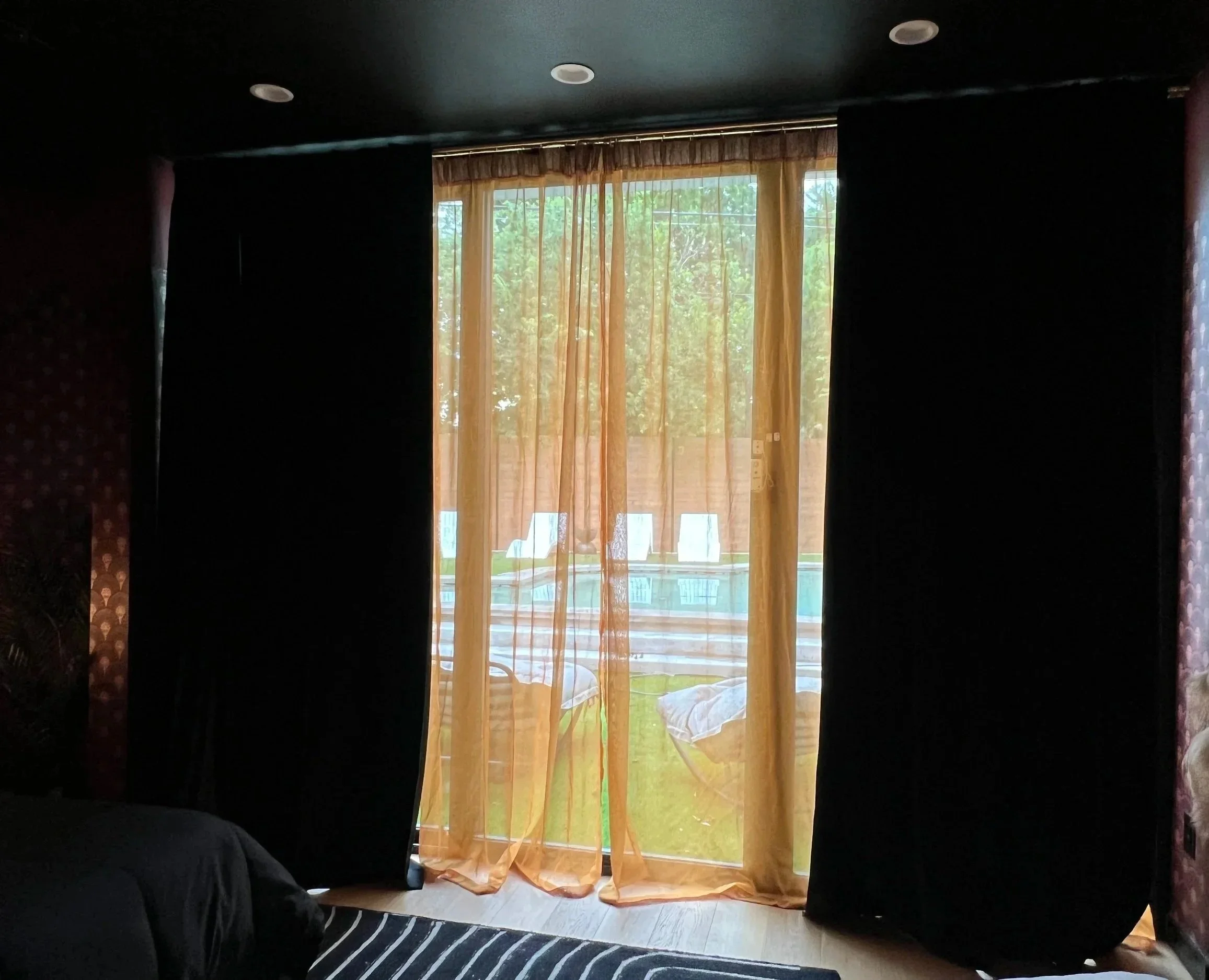 Black velvet pinch-pleated outer curtains were installed to provide privacy, sound reduction, and thermal insulation while remaining consistent with the property's art deco style. A sheer inner curtain layer allows natural light to filter in while still offering privacy when desired.